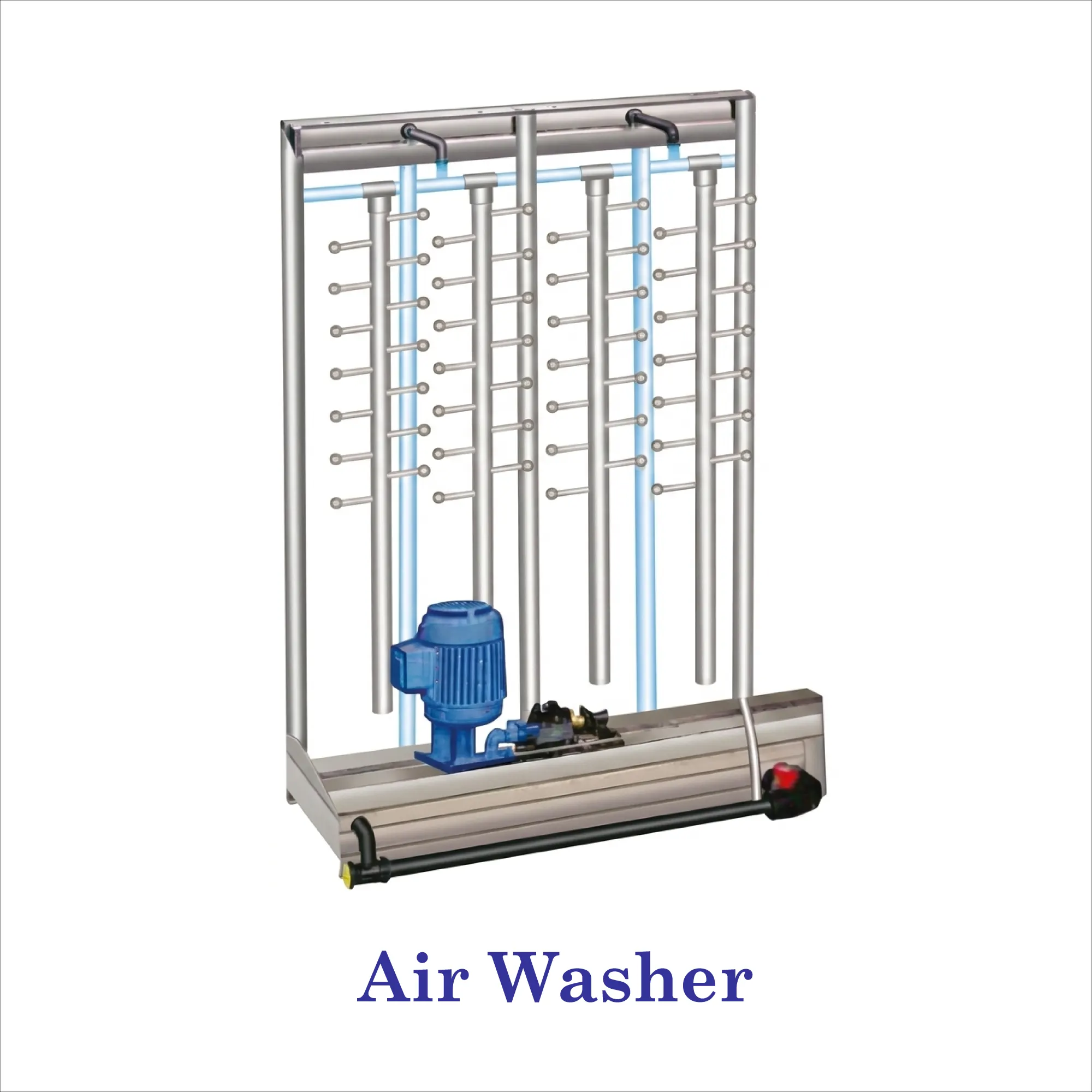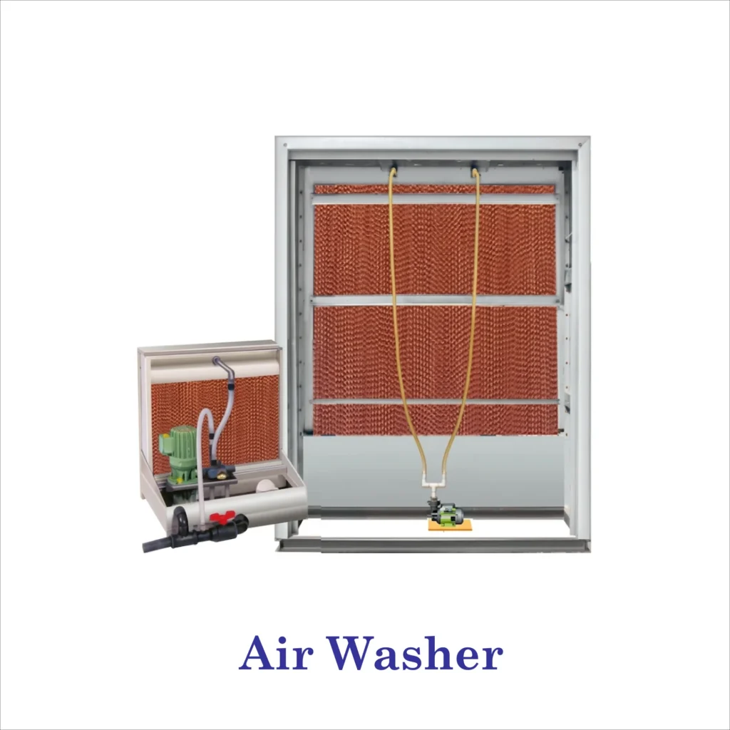 Conventional Spray nozzle type Air Washer injects water into the air stream in the form of mist.By breaking the water into fine particles, we increase the surface are by multiple folds for the same volume of water. The entire piping is done with GI pipes. The pump is located inside or outside the unit as per